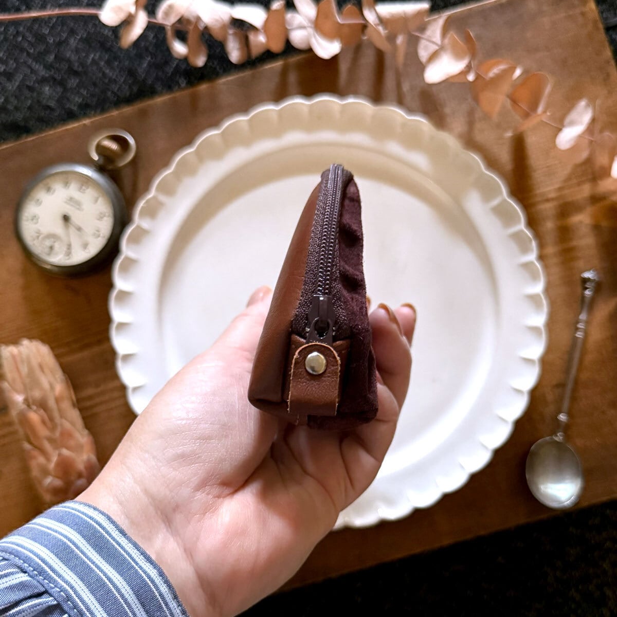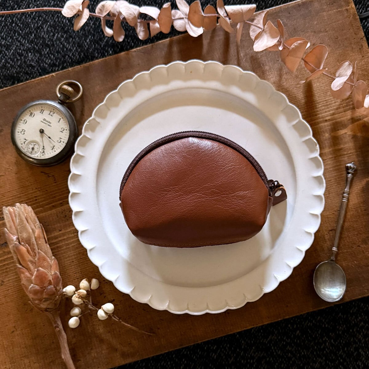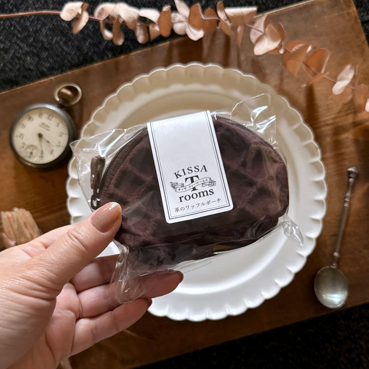 深い色合いが魅力の革のワッフル半月ポーチです。