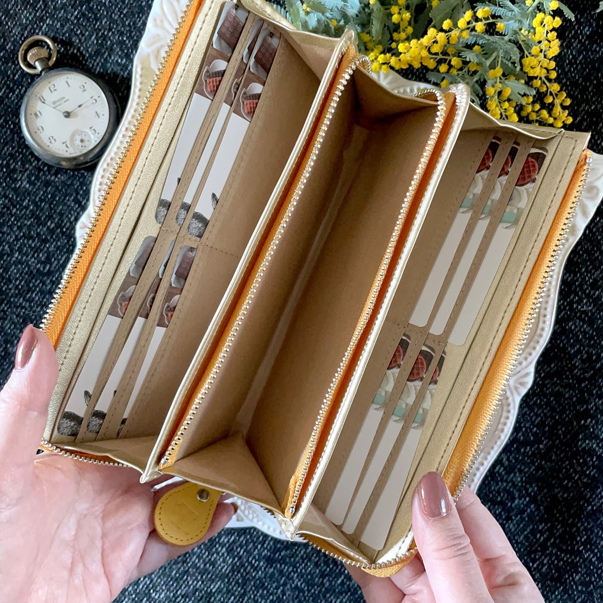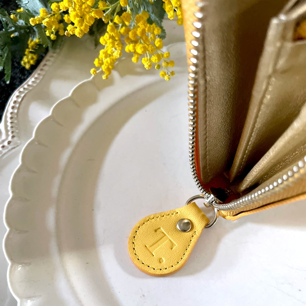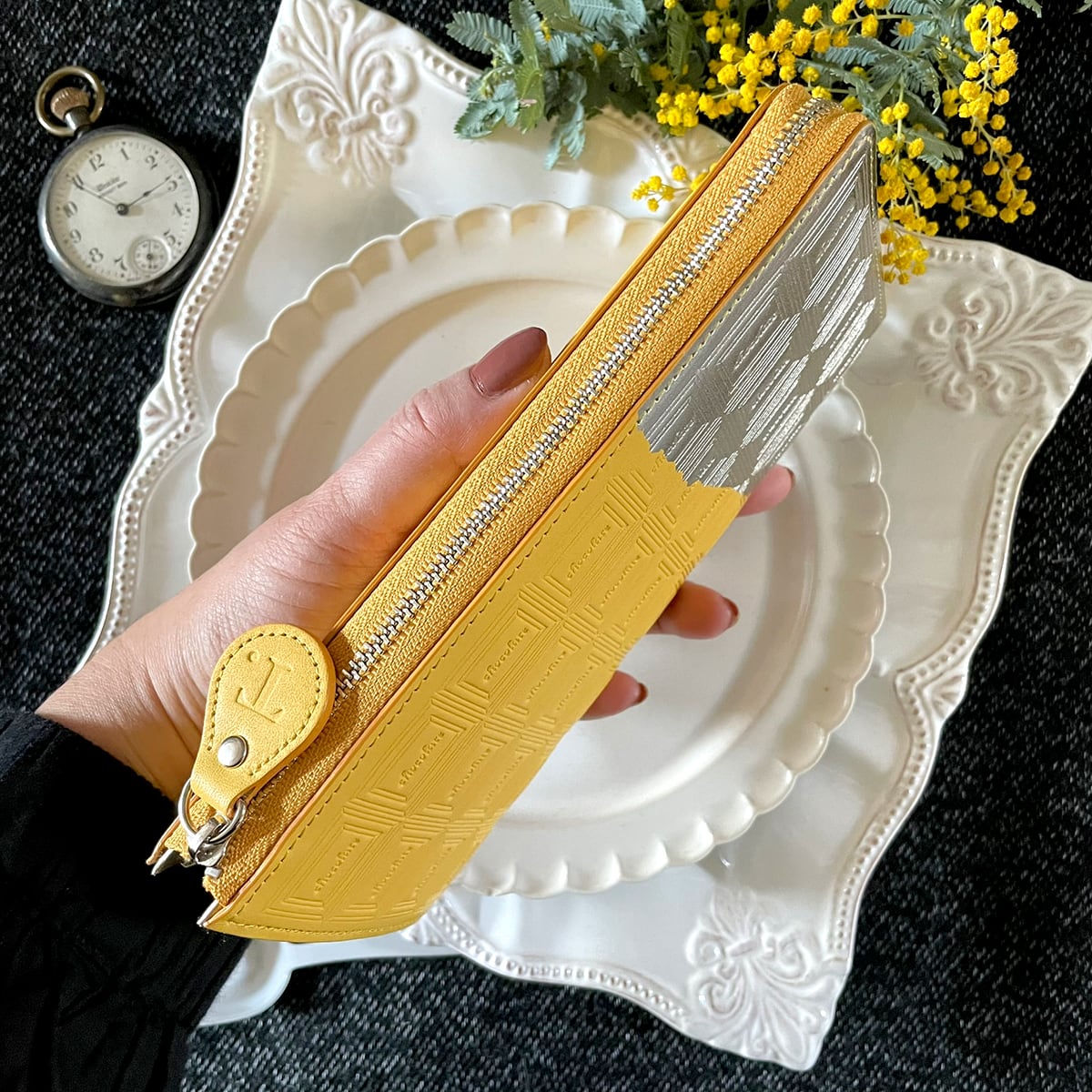 訳あり:革のミモザ色チョコ長財布(銀の包み紙)