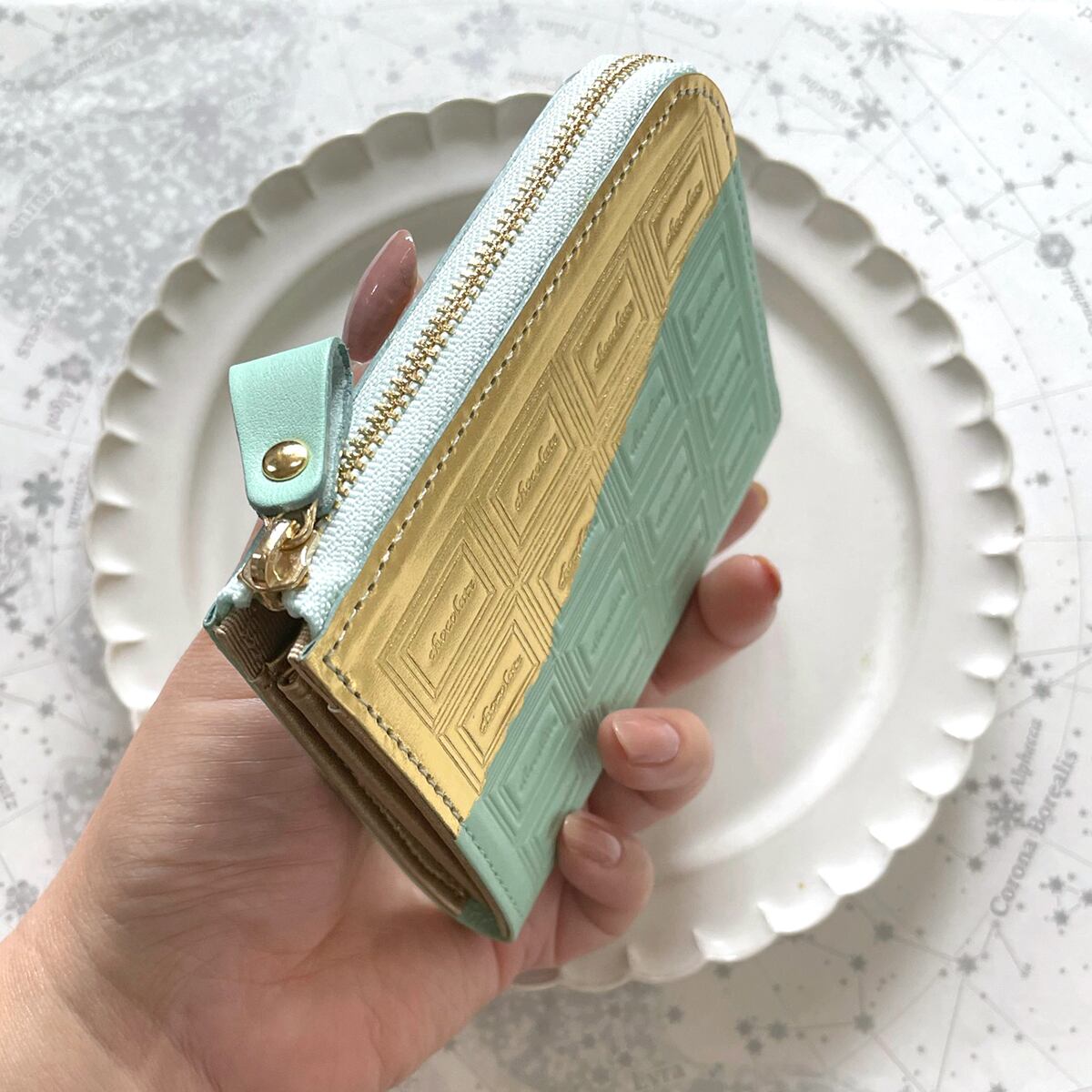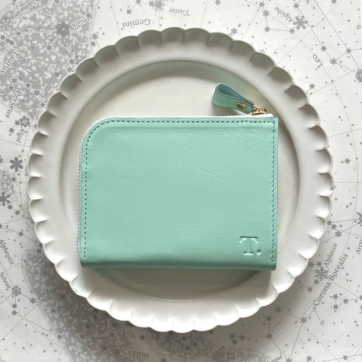 爽やかなミント色はオリジナルで染色した牛革を使い