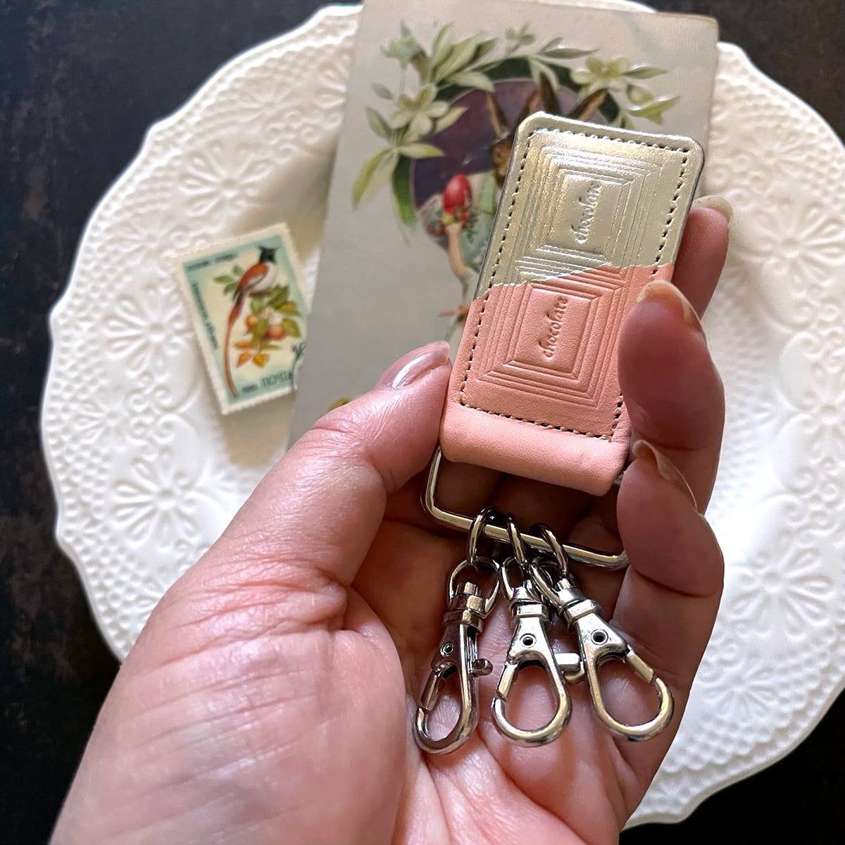 上質な革にチョコレートの版を押したキーホルダー。