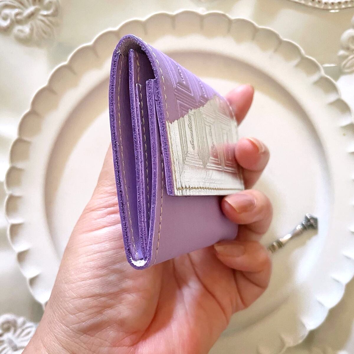 革の菫色チョコ・コインケース(銀の包み紙)