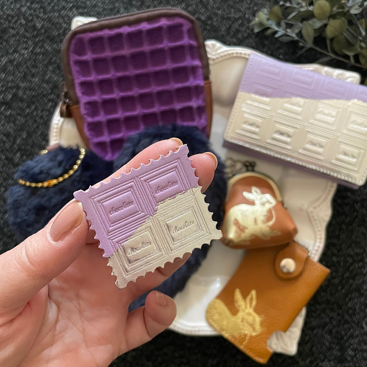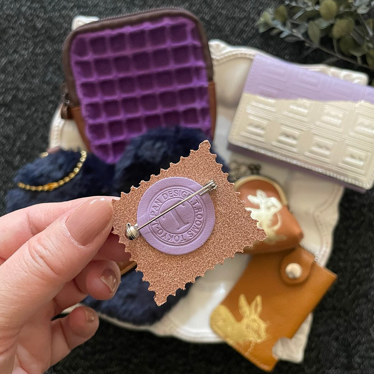 ・革の菫色チョコ 切手型ブローチ(銀の包み紙)