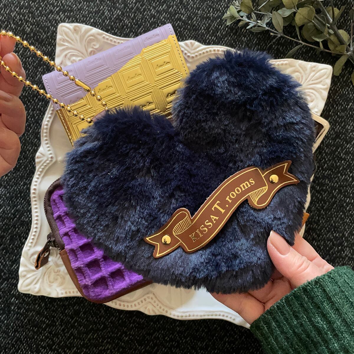 3)フェイクファーのハートポーチ(ネイビー)